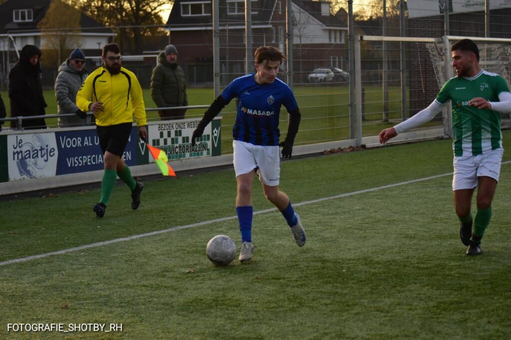 Waar Tubanters vorige week dramatisch aan de wedstrijd begon bleek de ploeg niet geleerd te hebben van deze valse start. Na dom balverlies na 1 minuut werd de rechtsbuiten weggestuurd en die kon schuin op doelman Timo Bulters af. Koud in veld tikte Timo de inzet uit zijn korte hoek, naast. Maar ook Tubanters werd dreigend in de beginfase. Giovanni Bhondoe vond Niek Wösting, die knap ruimte voor zichzelf maakte. Het schot van de aanvaller ging maar net naast het doel. Maar toch kreeg Tubanters weer snel een tegentreffer te verwerken. Wederom zorgde dom balverlies voor een tegenstoot. Waar vervolgens Jelmar Kock nog kalm leek weg te kunnen werken, schoot de verdediger de bal onnodig over zijn eigen achterlijn. Een gratis corner, die tijdens de Sinterklaas periode graag werd uitgepakt door Victoria. Nou ja… het was eigenlijk Tubanters die het nog makkelijker maakte. Want bij de eerste paal kwam de bal ongelukkig op de knie van Twan van Ooijen, die daardoor zijn eigen doelman kansloos liet, 1-0. Een tikje, maar al snel kwam de uitploeg op gelijke hoogte. Een hoekschop kwam na slecht uitverdedigen voor de voeten van Simone Sebastiani. En onze Italiaan kan aardig schieten, zo bleek ook deze middag. Hij tekende voor de 1-1 met een goed afstandschot. Vervolgens ontstond er een duel waarin Tubanters op zoek ging naar een voorsprong, maar waar Victoria toch stand bleef houden. Toch kreeg de thuisploeg ook haar kansjes. Na een klein half uur vond de Victoriaanse linksbuiten de vuisten van Timo Bulters. Voor rust werd Tubanters nog tweemaal dreigend. Eerst volleerde Jelmar Kock een afvallende bal tussen de palen. De doelman stopte deze met de gebalde vuisten en niet veel later had diezelfde doelman een katachtige redding in zijn mars. Over links zette Luca Feddes goed door en kon de bal vanaf de achterlijn nog net voorkrijgen. Joppe Platvoet dook weer eens op in de vijf meter en leek de bal eenvoudig binnen te schuiven. Hij had alleen niet gerekend op de snel reagerende doelman, die daardoor de bal nog tegen zich aankreeg. Zo bleef het na 45 minuten, 1-1. Een stand die ook vorig jaar halverwege op het scorebord stond