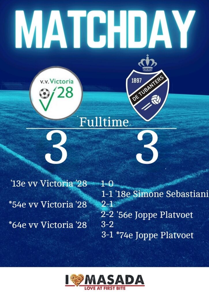 Met dezelfde elf namen ging Tubanters dan maar op zoek naar een voorsprong. En niet zoals vorig seizoen in het Victoriaanse mes lopen. En het leek goed te gaan, want Luca Feddes was op weg naar een snelle treffer. Hij schoot vanaf links de bal hard langs de keeper, maar had niet gerekend op een speler die op de doellijn stond. Deze kon de inzet nog net wegwerken. Maar aan de andere kant ging het weer fout. Wederom balverlies op het middenveld en wederom een aanvaller die ontsnapte. Alleen schrok die er zelf ook van, want één op één met Timo Bulters schoof de spits de bal naast het doel. Nou lijkt Tubanters toch wel gewaarschuwd, maar niets bleek minder waar. Een ingooi kreeg Victoria ’28 op de linkerkant. De bal werd als een vuurpijl voorgeschoten. En daar ging het mis. Giovanni Bhondoe liet zich in de lucht kloppen en zag de bal via de binnenkant van de paal binnenvallen, 2-1. Wederom kon Tubanters op jacht naar een gelijkmaker. Maar ook nu duurde dat niet lang. 2 minuten na de tegentreffer was het namelijk Joppe Platvoet die weer een doelpuntje mee pikte. Een hoekschop werd door Niek Wösting voorgegeven. Jelmar Kock verlengde en via een aantal Victorianen kwam deze bij Joppe Platvoet. En dan is het raak… want de topscorer van Tubanters kopte de bal hard tegen de touwen, 2-2. Zal Tubanters nu dan bij de les zijn? Nee hoor, want het kwam wederom onnodig op achterstand. Eerst dook Timo Bulters nog een vrije bal uit zijn korte hoek, maar de hoekschop die vervolgens in de vijf meter viel werd binnengekopt, 3-2. Tubanters ging wisselen en bracht Luc Sonneveldt en Vieri Russo. En bij het eerste balcontact leek de rappe buitenspeler direct raak te schieten. Luca Feddes kopte een diepe bal goed terug voor het doel, waar Vieri Russo opdook. De invaller schoot de bal vervolgens maar net over. Victoria kon meer en meer aan counteren denken en zag Timo Bulters nog redding brengen op een schotje. Maar met nog een krap kwartier op de klok kwam Tubanters dan toch voor de derde maal deze middag op gelijke hoogte. Dominique Jager slalomde vanaf achteruit door het middenveld van Victoria. Hij leek ongrijpbaar en Dominique zag zijn kans schoon om te schieten. Zijn schot werd nog geblokt, maar doordoor zorgde de blok voor een onverwachte assist. De bal viel voor de voeten van Joppe Platvoet en koeltjes schoof de spits zijn 14e van het seizoen en de 3-3 deze middag binnen. Een kwartier restte de ploeg van trainer Peter Bokma nog. Maar weer liet de ploeg zich op Wesselerbrink van een niet overtuigende kant zien. Er werden ook veel verkeerde beslissingen genomen. Een schot van ver werd eenvoudig opgepakt, een duwfoutje hier in een volle zestien waardoor geen kans kon onstaan. Zo bleef de ploeg worstelen, kwam het niet in gevaar maar had het echt een wonder nodig om nog te scoren. Even leek die er alsnog te komen, toen Vieri Russo in de zestien, tegen 3 tegenstanders zijn trukkendoos opengooide. Met kappen, draaien en een beetje geluk schoot de invaller nog op doel, maar via een groen/wit been ging deze rakelings naast.
